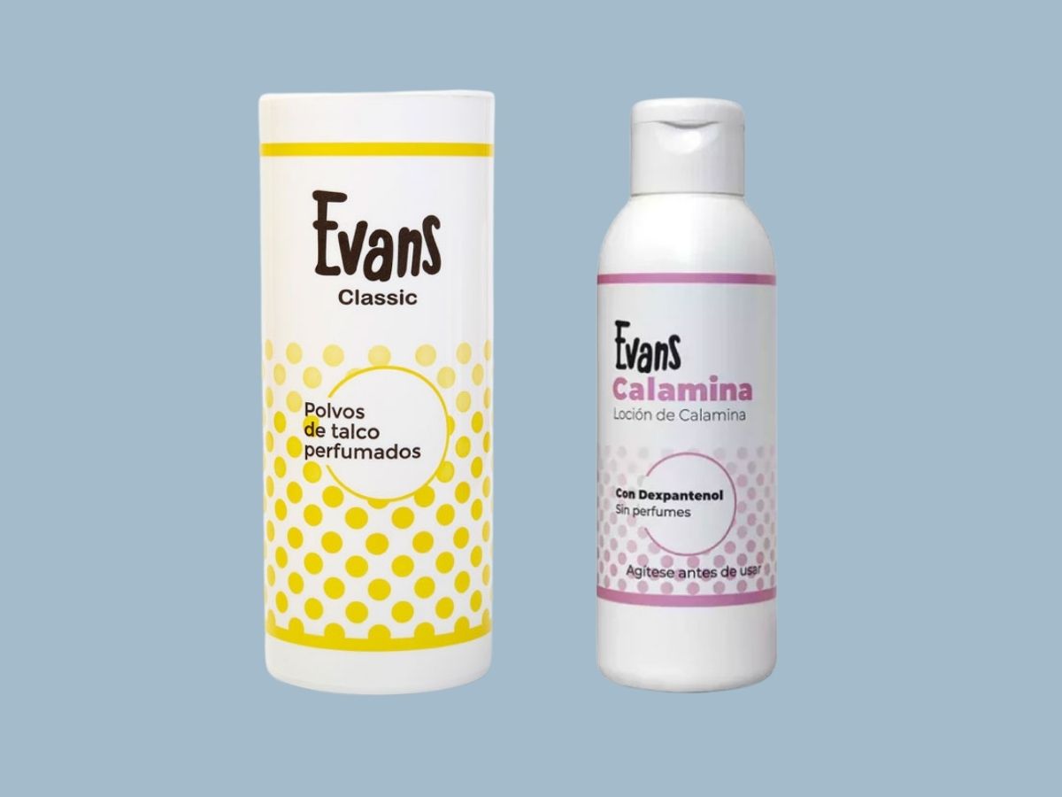 Calamina Evans Loción de 125ml y Talco Evans: protector de la piel indicado para evitar rozaduras, suavizar la piel y perfumarla.  Fabricado en España con calidad farmacéutica, agradable perfume.